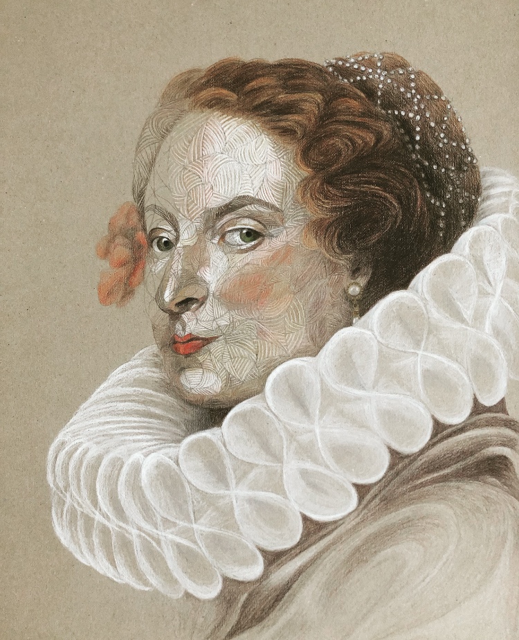 The inspiration comes from Old Masters on the one hand and photographs depicting actresses on the other hand. She tends to chose famous portraits from the Renaissance and Baroque period and images of rather well-known actresses from the past and present because the audience is able to recognize them, which creates an immediate link between the artwork and the viewer.